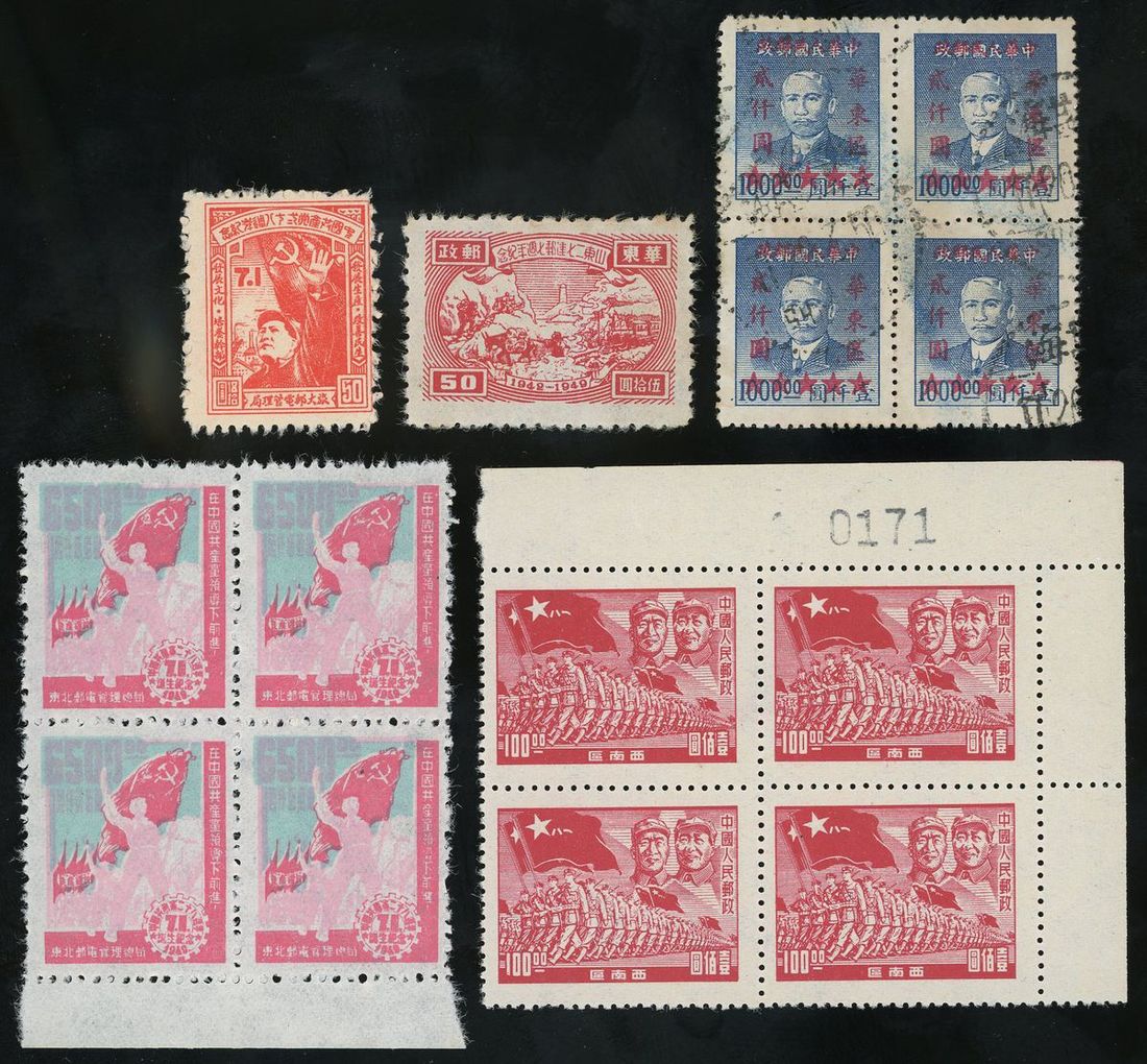 1946 Liaoning Post handsurch. on the stamps of Japan 20c. on 3c. green, corner block of nine, unmounted mint, 1949 Communist Party $50 unused, also some other Liberated Areas, block of four, mint and used stamps, fine.