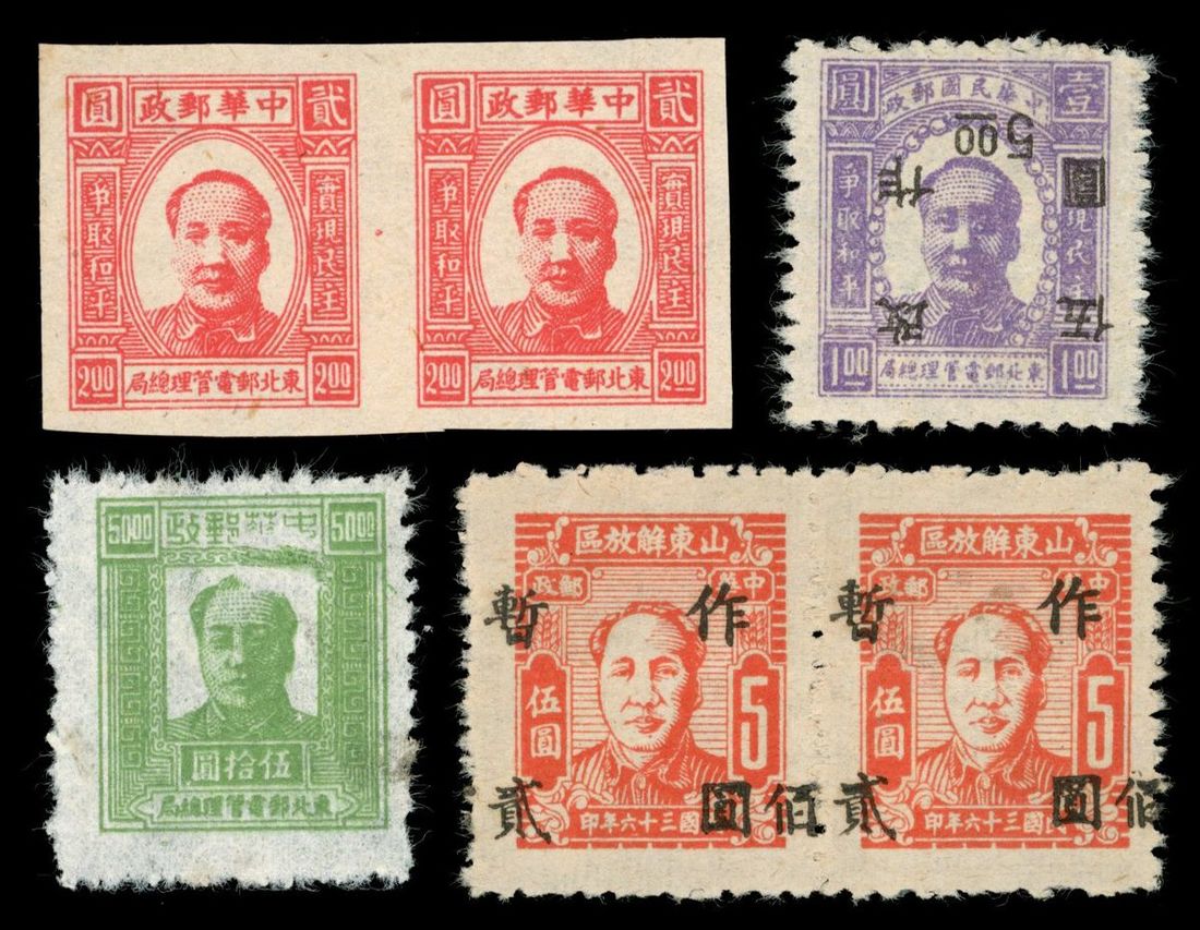 解放區毛像題材變體票4件,包括東北區第一版毛像2元無齒雙連1件;第二次毛像加蓋改值1元改5元倒蓋1枚;第三版毛像5元破版變體1枚;華東區毛像第三次加蓋暫作5元加蓋暫作貳佰圓雙連騎縫加蓋變體1件,整體保存完好