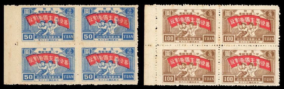1947年東北解放區五卅廿二周年紀念新票四方連1套,均帶左邊紙,票面顏色鮮豔,齒孔完整,部分微黃,上中品