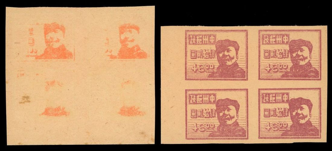 1948年中南解放區開封版毛像新票四方連1套,其中1元上兩枚圖案較清晰,整體邊緣裁切整齊,上中品