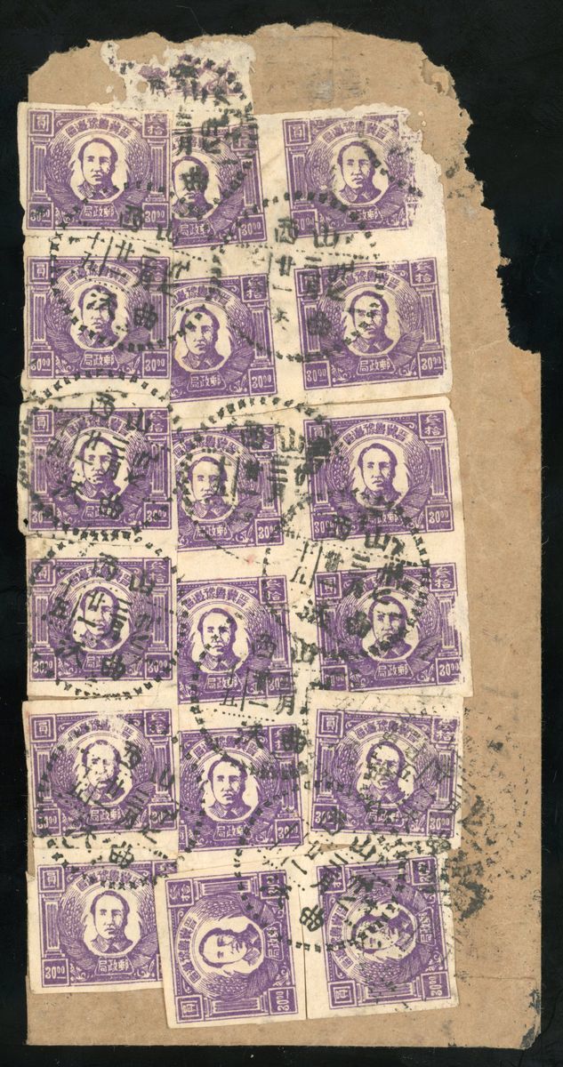 1948年山西曲沃寄平順縣實寄封1件,貼嘉禾版毛像30元18枚(另有郵票脫落現象),銷山西曲沃3月21日戳,有鳥徽圖3月27日戳,郵戳清晰,保存完好
