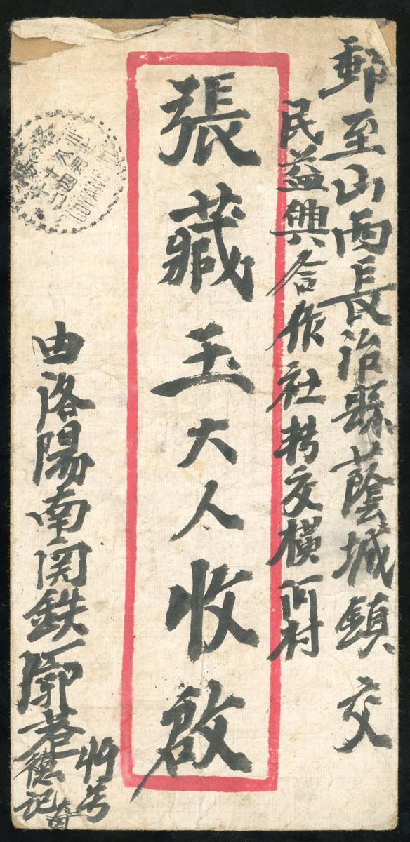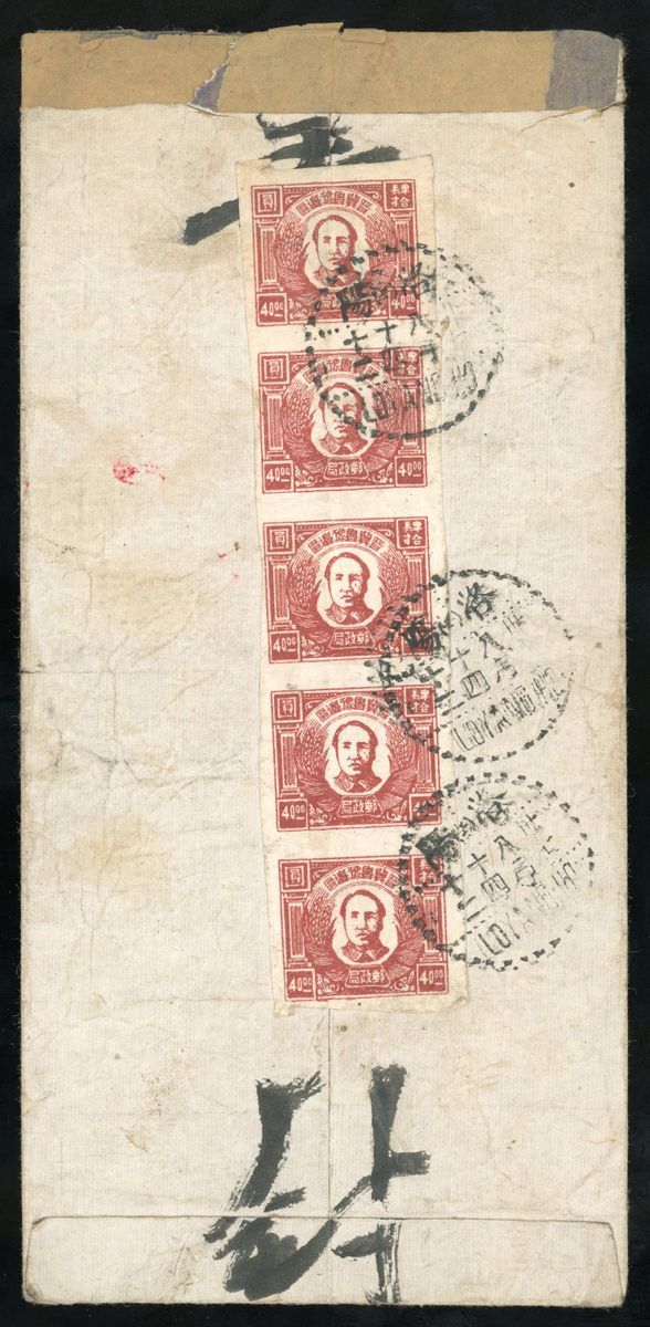 1948 (14 Aug.) envelope to Changtze, Shansi bearing Harvest design $40 light brown vertical strip of five tied by Loyang dotted c.d.s., a rare cover.