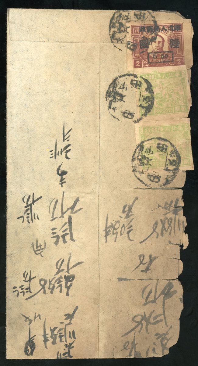 1949年沁源本埠實寄封1件,貼嘉禾圖毛像加蓋改制6元1枚,華北解放區衝鋒圖2元2枚,銷大嶽鳥徽日期手填戳,手填日期6月29日,封左側稍有老化,整體保存完整