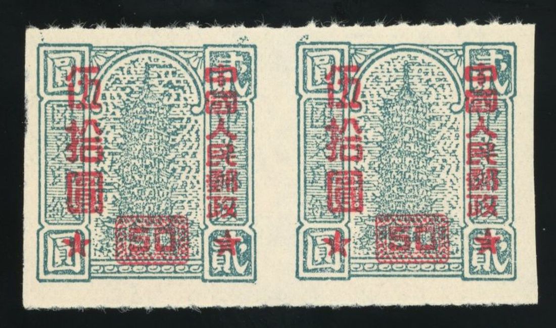 1951年改10貳圓改伍拾圓新票橫雙連1件,中縫漏齒變體,票面顏色鮮豔,加蓋字模清晰,保存完好,改票傳統郵集難得素材