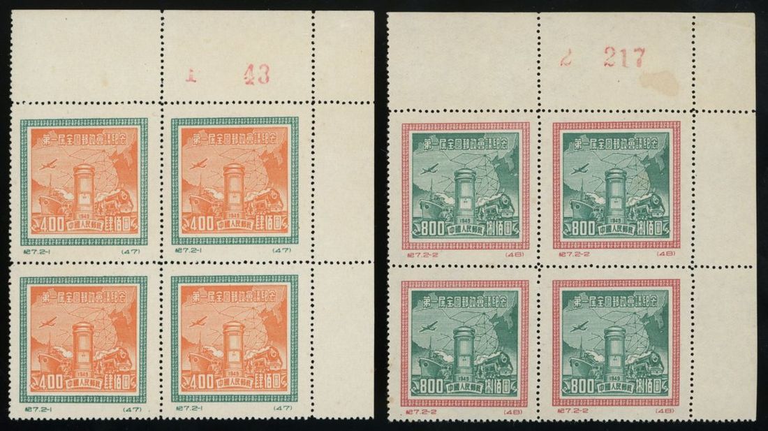 1950年紀7第一屆全國郵政會議紀念原版新票四方連1套,帶右上直角邊紙,邊紙蓋流水號,票面顏色鮮豔,上中品