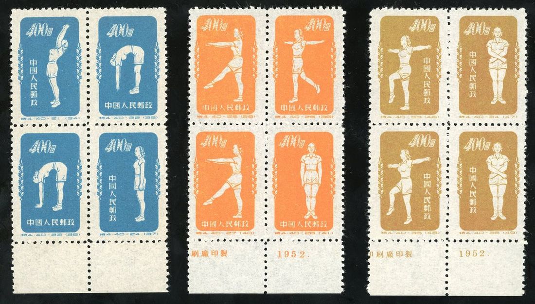 1952年特4體操原版新票1套,部分帶廠銘邊紙,票面顏色鮮豔,齒孔完整,上中品