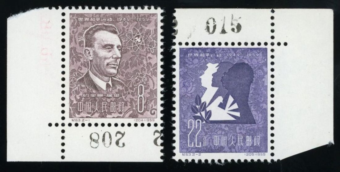1959 (25 Jul.) C63 10th Anniversary of World Peace Council 8f and 22f. both with lower left corner and top right corner sheet number marginal, unused, fine.