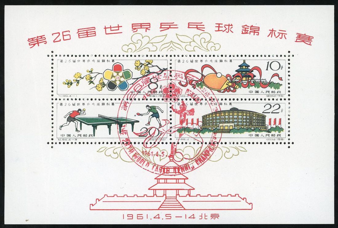 1961年紀86M世乒賽小全張蓋銷1枚,票面顏色鮮豔,金粉閃亮,四角尖,背貼,上中品