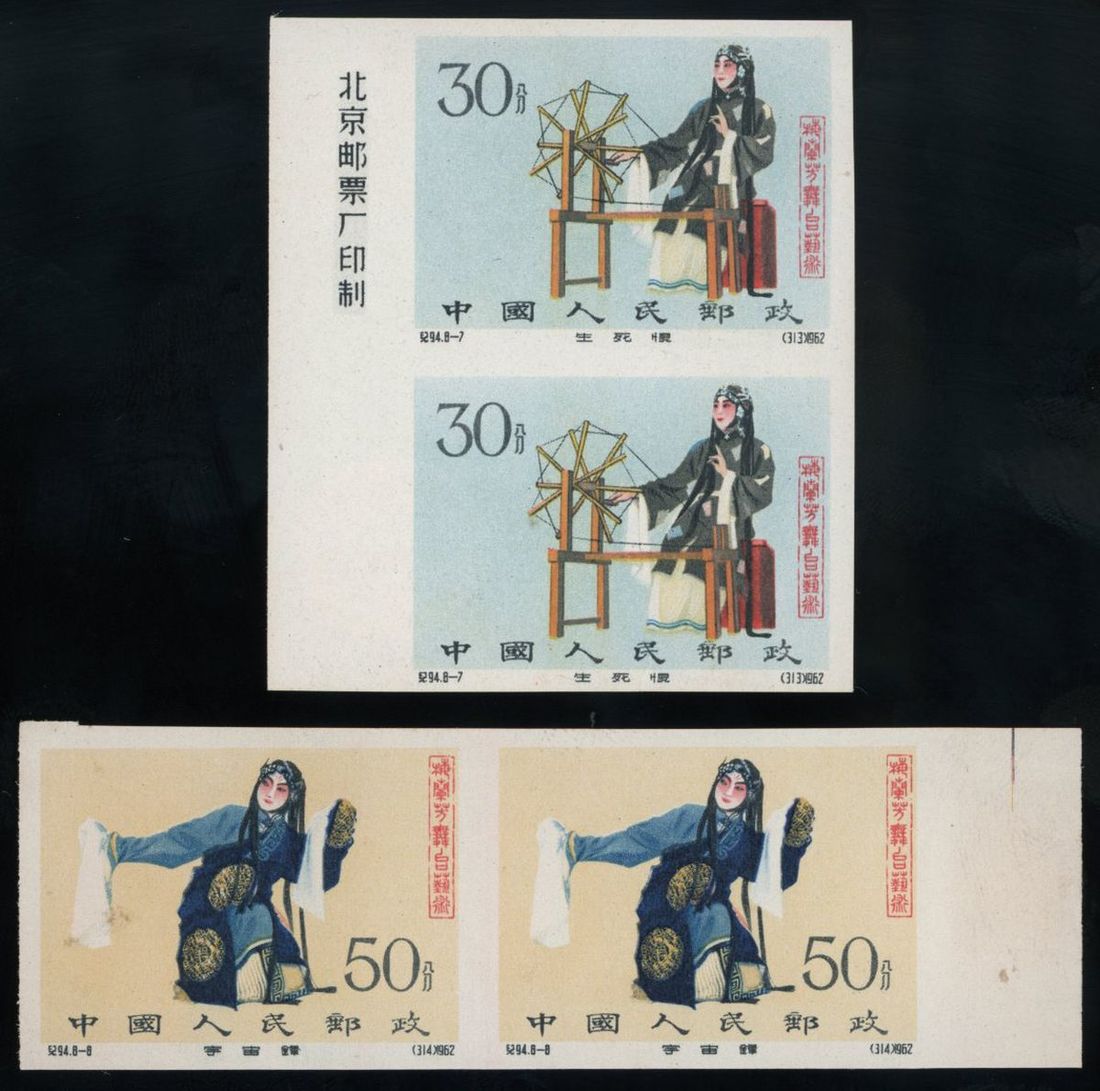 1962年紀94B梅蘭芳無齒雙連新票1套,除22分及30分為直雙連外,其餘均為橫雙連,其中肖像,遊園驚夢,宇宙鋒帶右邊紙;抗金兵,穆桂英,生死恨帶左邊紙,生死恨邊紙帶廠銘,票面顏色鮮豔,裁切整齊,原膠,背膠有黃斑,上中品,少見