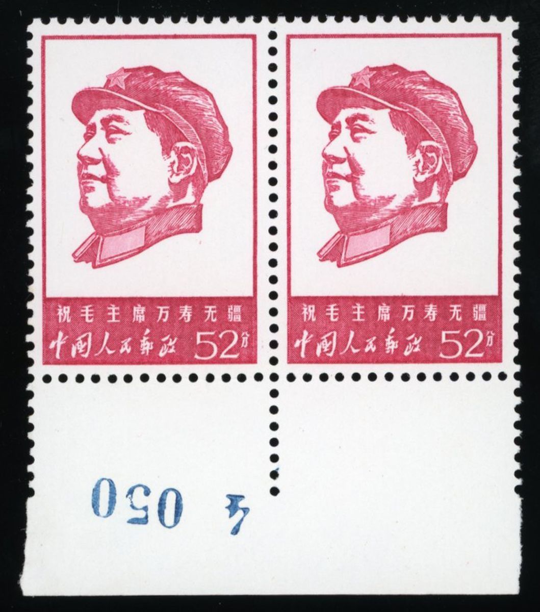 1967年文4毛主席萬壽無疆52分新票橫雙連1件,帶下邊紙,邊紙有流水號,票面顏色鮮豔,齒孔完整,左側票背面微小揭薄,整體上中品