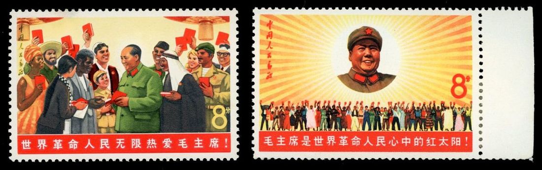 1967年文6毛主席是世界革命人民心中得紅太陽新票1套,其中紅太陽1枚帶右邊紙,票面顏色鮮豔,紅太陽下邊齒弱,原膠,整體上中品