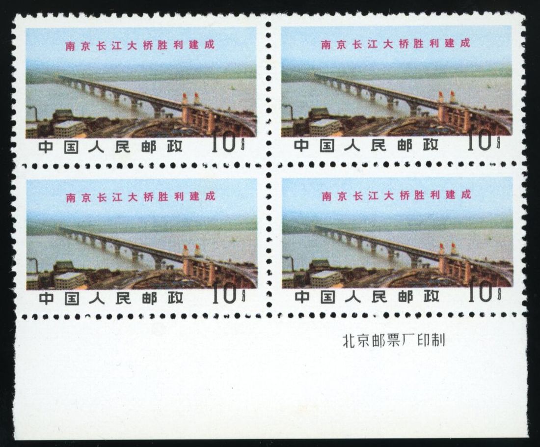 1969年文14南京長江大橋新票四方連1套,均帶邊紙,部分邊紙帶廠銘及色標,8分公路橋邊紙蓋印刷日期,整體票面顏色鮮豔,齒孔完整,上中品