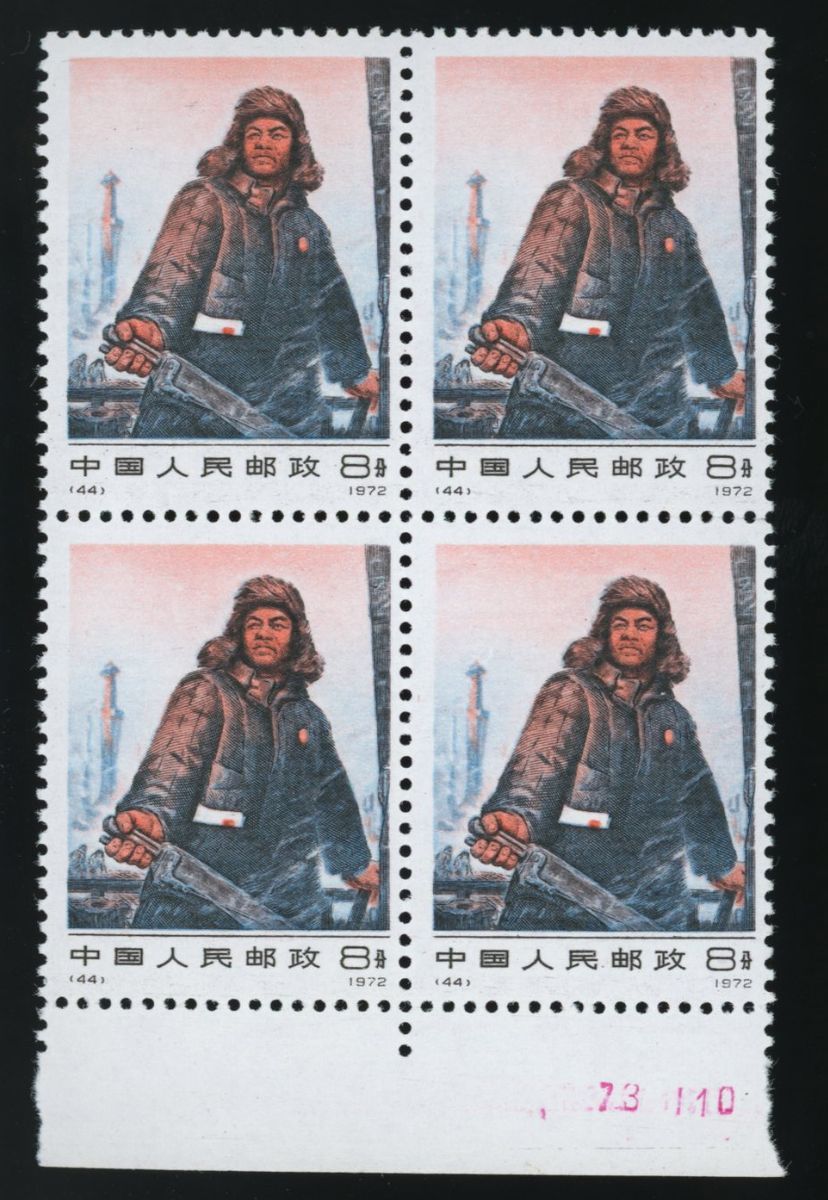 1972年編44王進喜新票四方連1件,帶下邊紙,邊紙蓋印刷日期,票面顏色鮮豔,齒孔完整,原膠,品相佳
