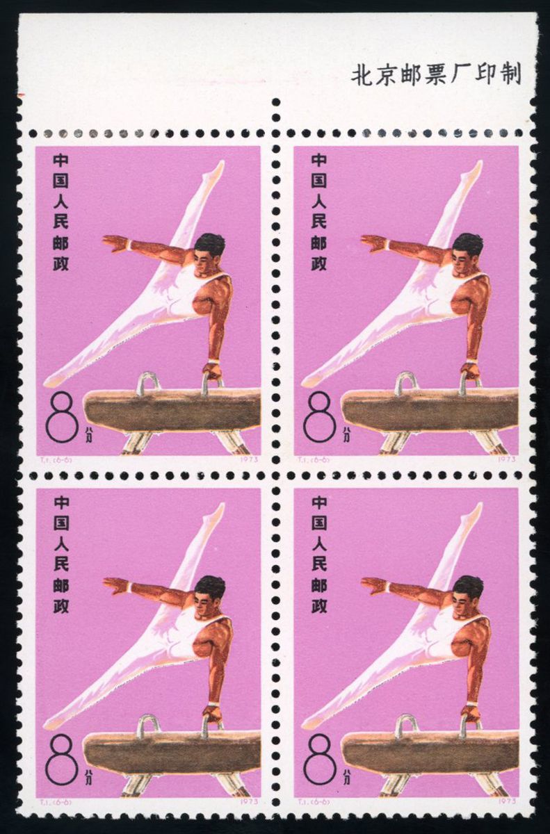 1974年T1體操新票四方連1套,均帶上廠銘邊紙,票面顏色鮮豔,齒孔完整,原膠,各別微黃,整體上中品
