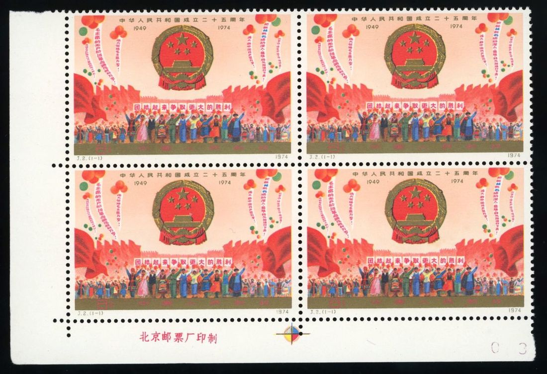 1974 (1 Oct.) J2 25th Anniv. of Founding of People's Republic of China, 8f. lower left corner margin with imprint, unmounted mint, toning.