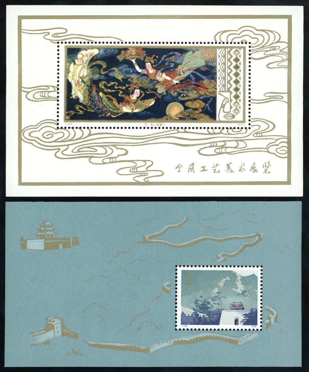 1978-79年JT小型張新票2枚,包括T29M工藝美術,T38M長城,整體票面顏色鮮豔,金粉閃亮,四角尖,原膠,上中品
