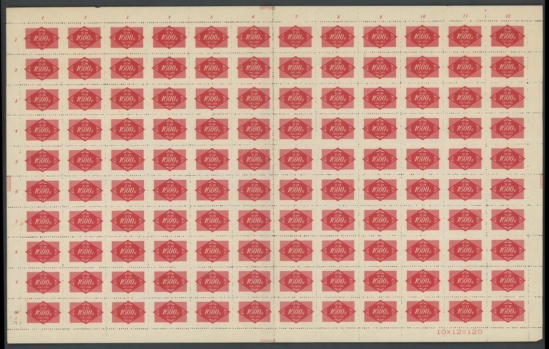 1954年紅欠資新票120枚全張1套,中間折版,票面顏色鮮豔,邊紙完整,上中品