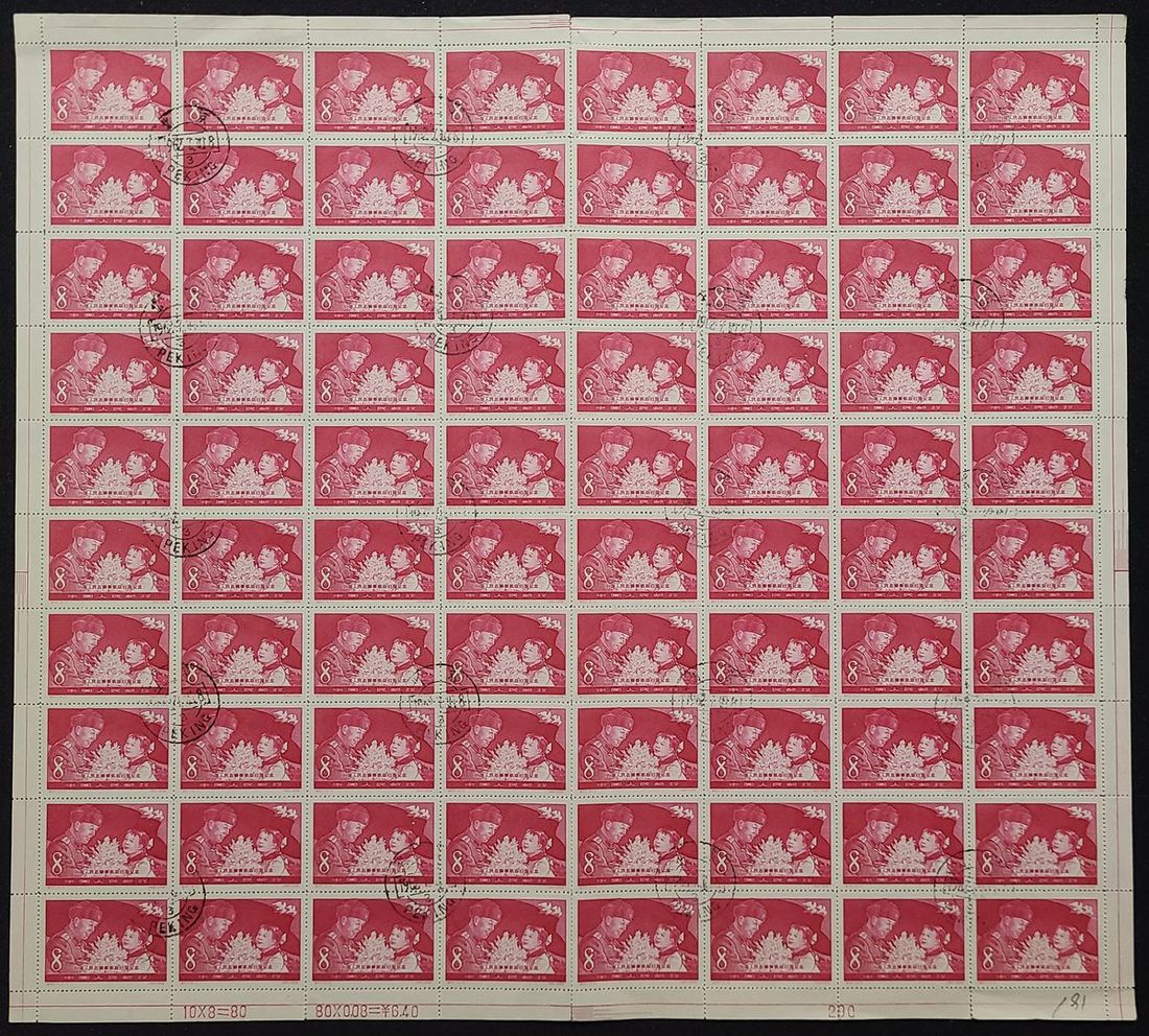 1958年紀57(3-3)志願軍歸國蓋銷票80枚全張1件,邊紙完整,保存完好