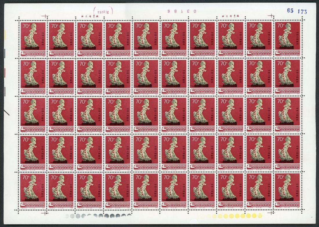 1978年T29工藝美術新票50枚全張1套,票面顏色鮮豔,邊紙完整,原膠,各別微黃,上中品