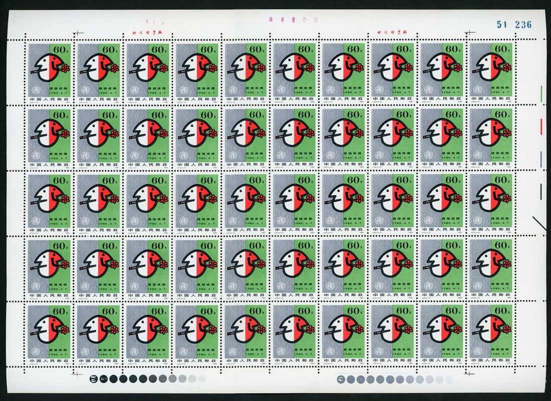 1980年J56戒煙新票50枚全張1套,票面顏色鮮豔,邊紙完整,原膠,微黃,上中品