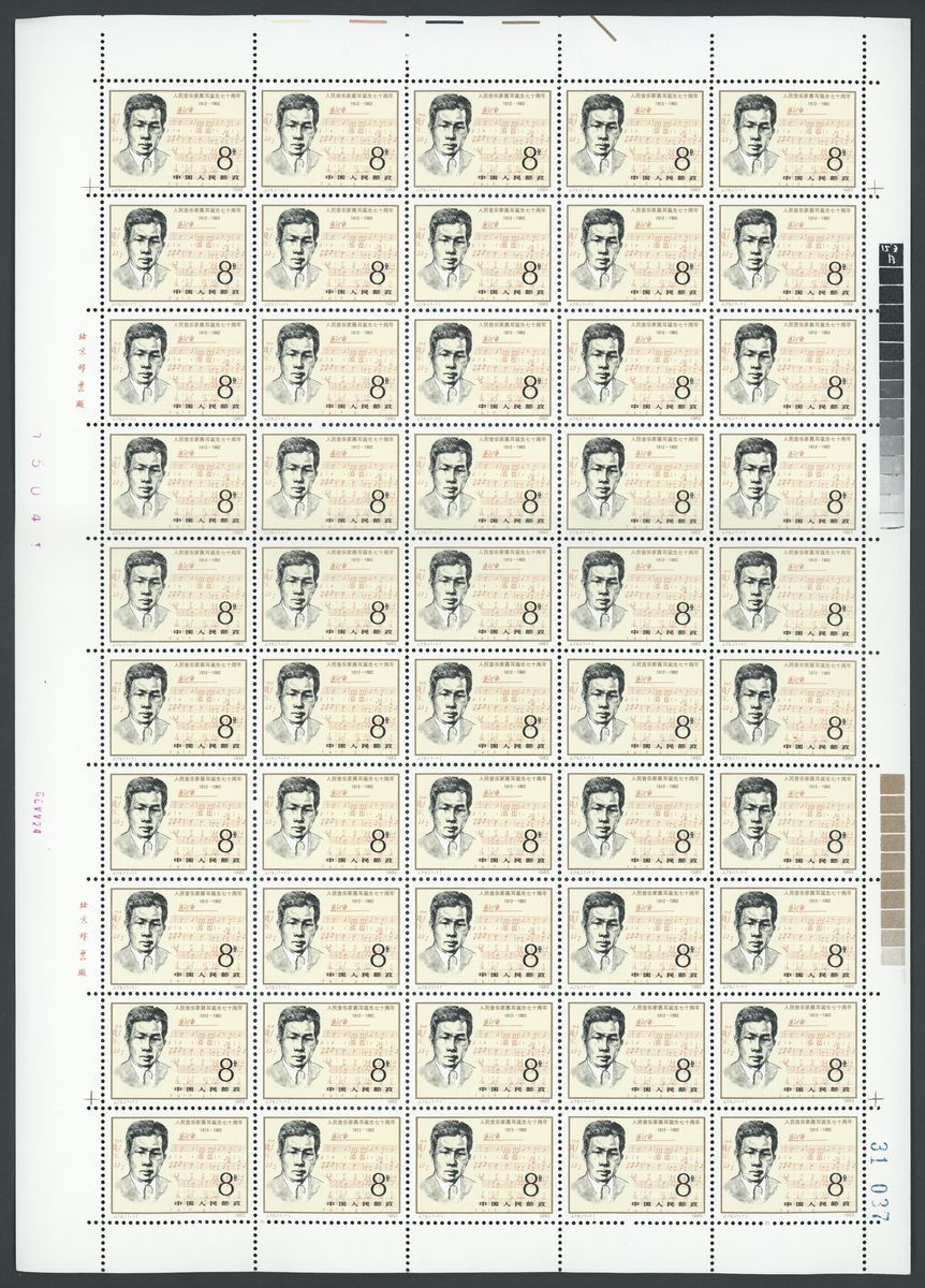 1980-82年新票全張一組,包括T57白鰭豚小版張1套,J75聶耳50枚全張2版,整體金粉閃亮,原膠,部分微黃,請預覽