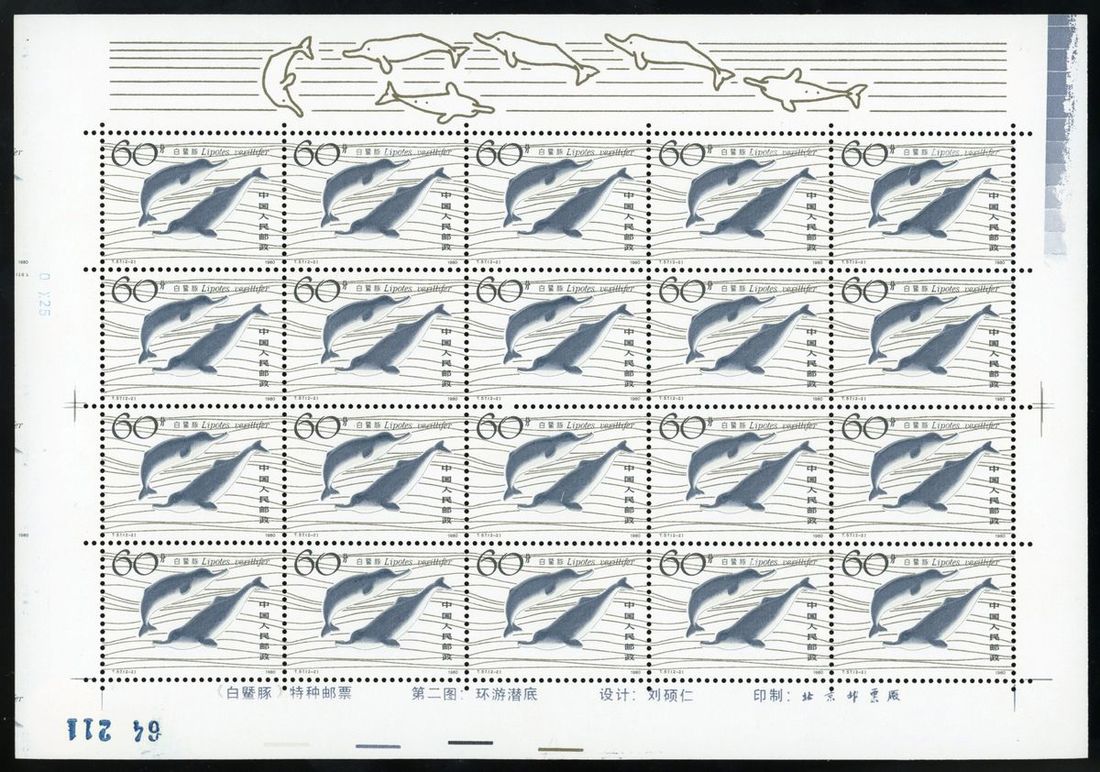1980年T57白鰭豚新票小版張1套,票面顏色鮮豔,金粉閃亮,四角尖,原膠,上中品