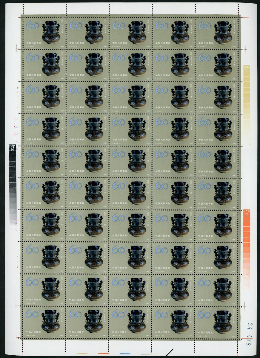 1981年T62陶瓷新票50枚全張1套,票面顏色鮮豔,邊紙完整,原膠,上中品