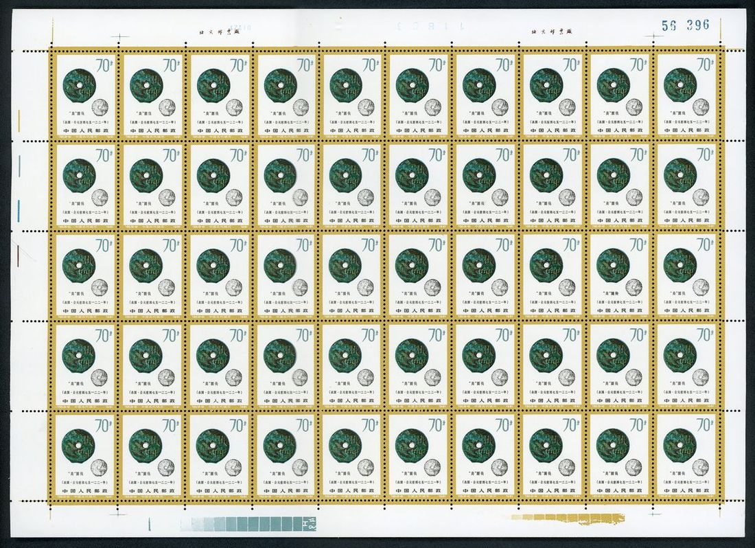 1981年T65古代錢幣第一組新票50枚全張1套,票面顏色鮮豔,邊紙完整,原膠,上中品