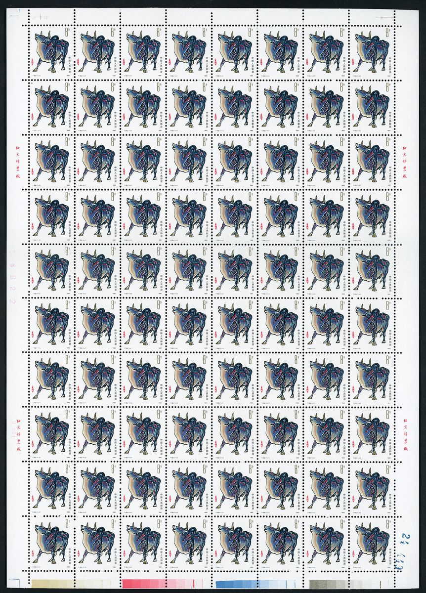 1985 (5 Jan.) Year of the Ox (T102) x 2, plus T107 x 2, T112 x 2, T124 x 2 & T146 x 1, full sheet of 80 stamps, unmounted mint.