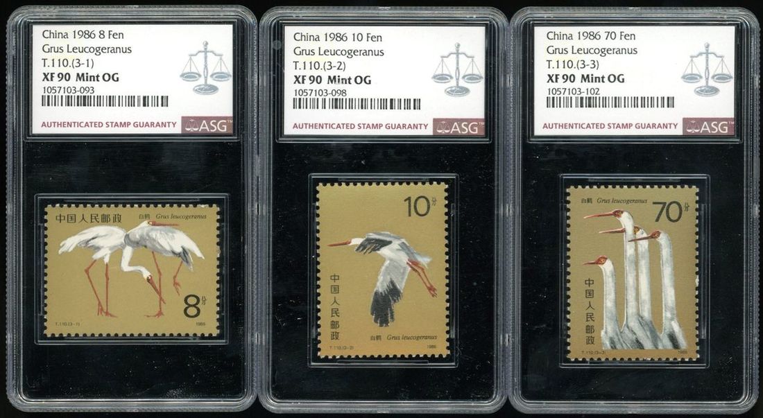 1986年T110白鶴新票6套,部分帶邊紙,均逐枚經ASG評級,分數從F/VF75至XF90不等,請預覽