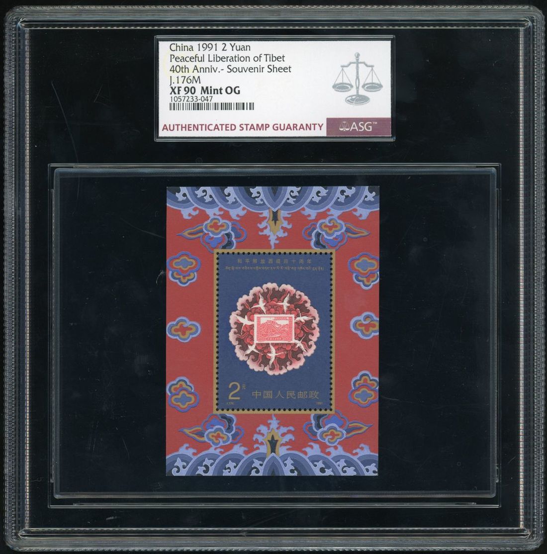 1991年J176M西藏小型張新票5枚,經ASG評級,分數從VF/XF85至XF90不等,請預覽