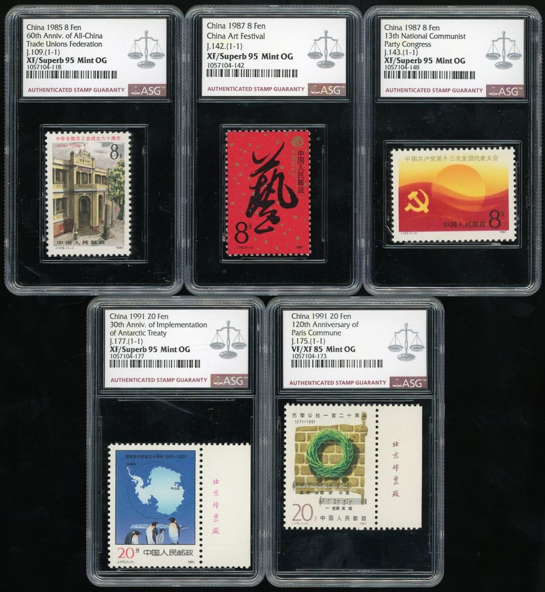 1985-91年JT新票18枚,包括J109,J142,J143,J177各四枚,J175兩枚,部分帶廠銘邊紙,均經ASG評級,分數從VF/XF85至XF/Superb95不等,請預覽