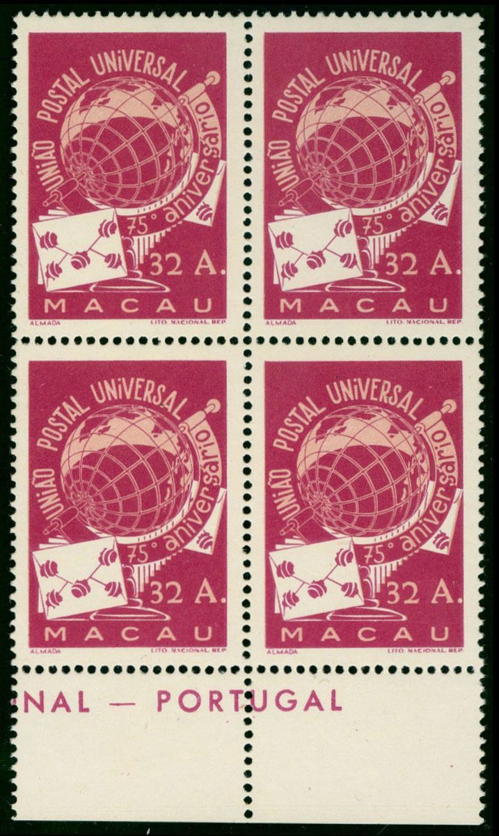 1949 U.P.U. 32a. purple in a lower margin block of four, unmounted mint. Choi C353; S.G. 424, £900. Photo