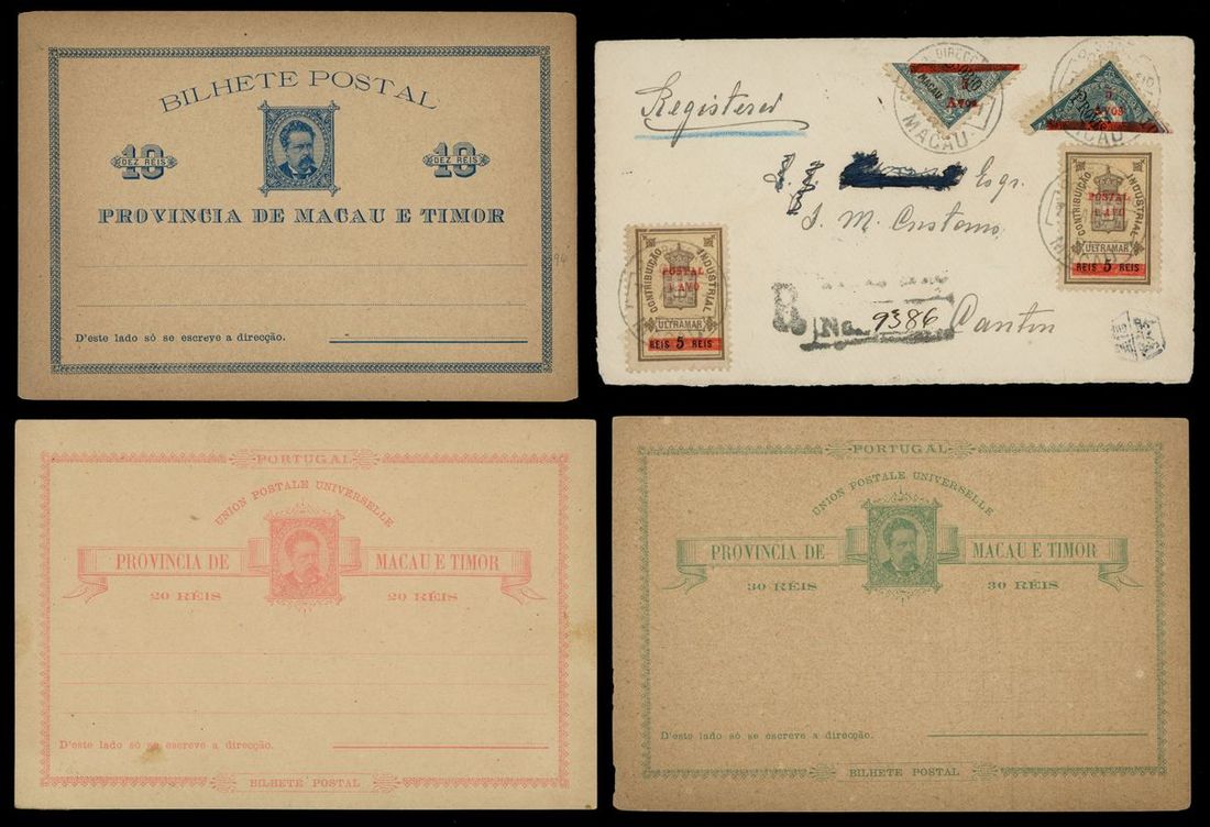 1911 (7 Aug.) registered cover front to Canton bearing D.Carlos surcharge 5a. on 10a. bisected (2) and Fiscal stamp surch. 1a. on 5r. (2) tied by Macau c.d.s., showing registered handstamp in black, plus 1885 D. Luis I stationery card 10r., 20r. and 30r. unused, fine.