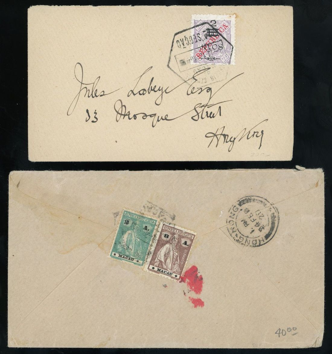 1919 (11 Dec.) cover from Macau to Hong Kong bearing Don Carlos I "Republica" 2a. on 18a. on 20r. on front and Ceres 2a. and 8a. on reverse cancelled by "Correio Central/de/Macau/2A Secção", with arrival c.d.s. (20.2.24), fine.