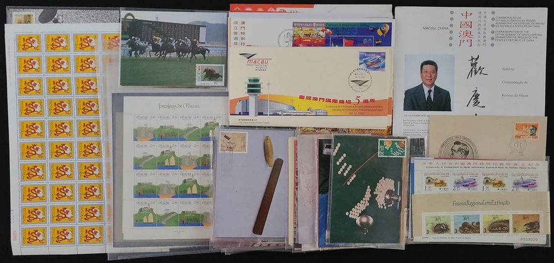 1985-96 small selection of small sheets, complete pane of 16 including Luis De Camoes Museum, Security Forces, Chinese Mythology, Legends and Myths, also Year of the Dragon sheet of fifty and maximum cards, some toning, mixed condition.