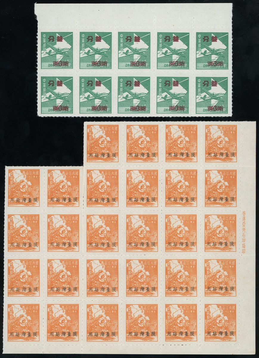 1949-56年臺灣新票一組,包括香港亞洲版單位票加蓋限臺灣貼用28方連1套,均帶原票廠銘邊紙;單位郵票加蓋改值三分十方連3種不同,整體票面鮮豔,上中品