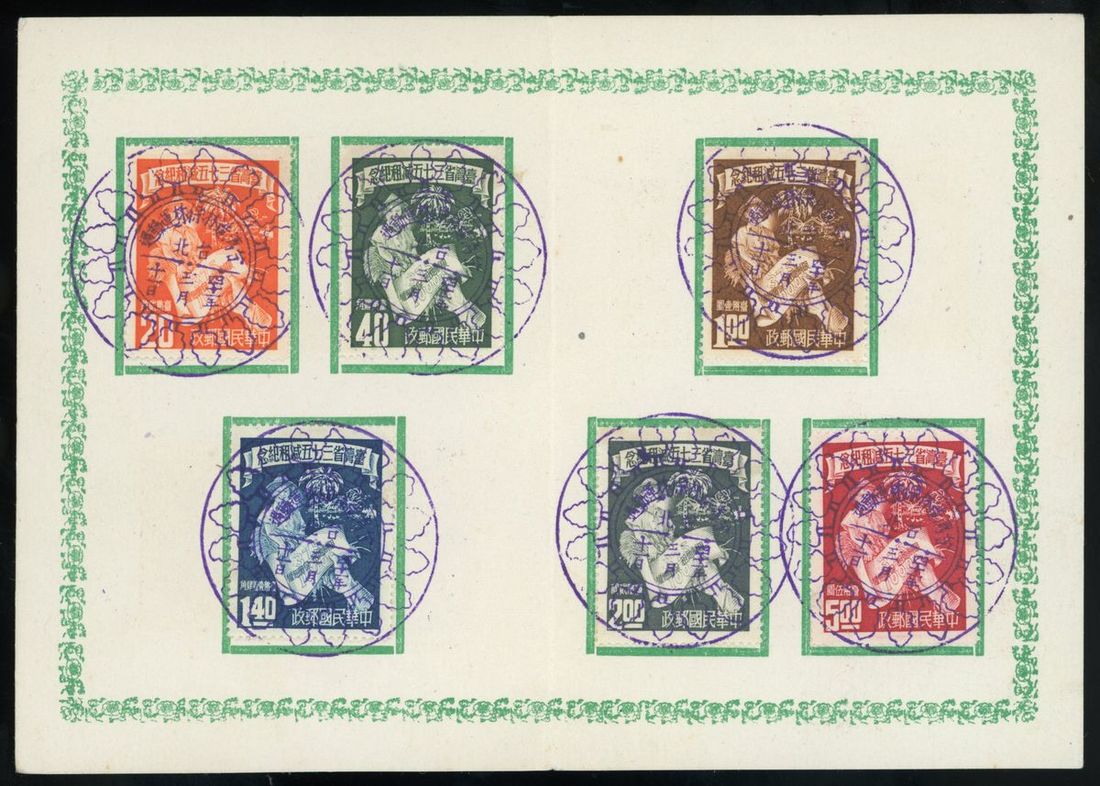 1952年臺灣郵政管理局贈臺灣三七五減租紀念郵票折1件,貼全套郵票,銷3月11日紀念戳,保存完好