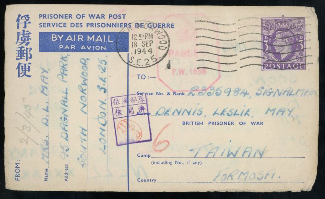 1944 (18 Sep.) Service Des Prisonniers De Gurre airmail postcard to Taiwan cancelled by South Norwood machine c.d.s., with censor seal alongside, fine.