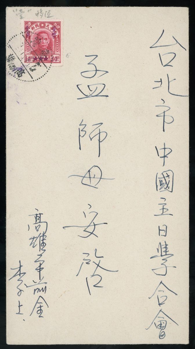 1950 (2 May) envelope to Taipei bearing Dr.S.Y.S. 10TW$ on $44 cancelled by Kaohsiung c.d.s., showing arrival c.d.s. on reverse, fine.