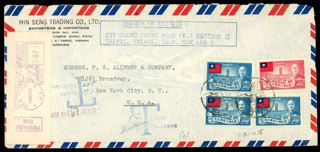 1952 (19 Mar.) airmail cover to U.S.A. bearing National Flag, Sun, and Chiang Kai-Shek 40c., $2 (3) cancelled by Taipei c.d.s., postage due with large unframed "T" h.s. in blue and a label with postage due 67c. machine d.s., fine.