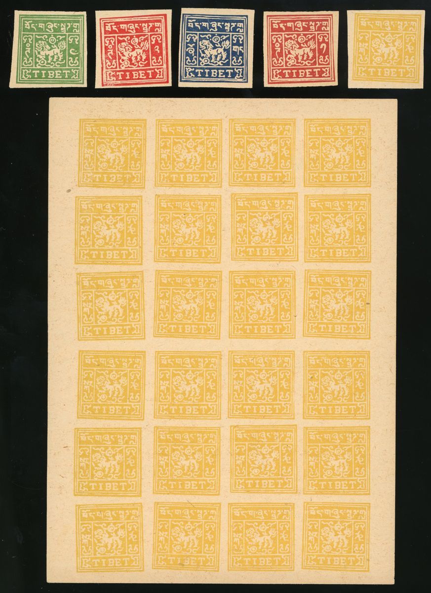 1933年西藏地方郵政第三版獅子圖郵票早期複製品一組,包括24枚全張1套,零票2套,整體保存完好