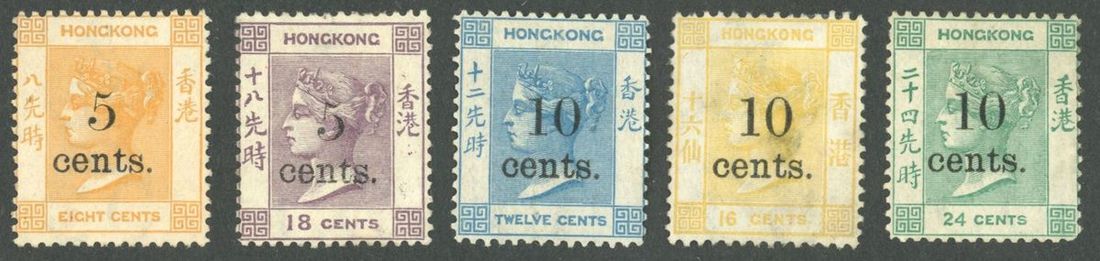 1880 surcharge issue by Noronha and Sons in Hong Kong, 5c. on 8c., 5c. on 18c., 10c. on 12c., 10c. on 16c. and 10c. on 24c. complete set of five, mint with original gum except 10. on 16c., fresh colour, a rare set, 5c. on 18c. with Sergio Sismondo certificate. Yang 23-27