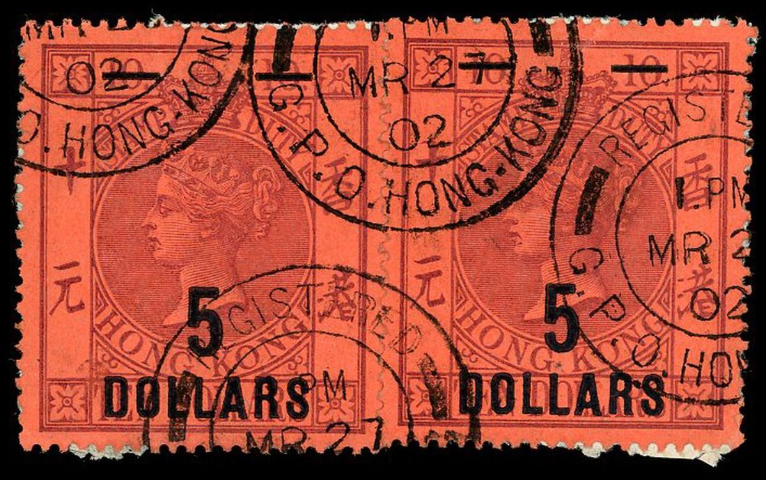 1891 (1 Jan.) Queen Victoria Postal Fiscal issue the 2nd surch. $5 on $10 horizontal pair, used. Yang F9