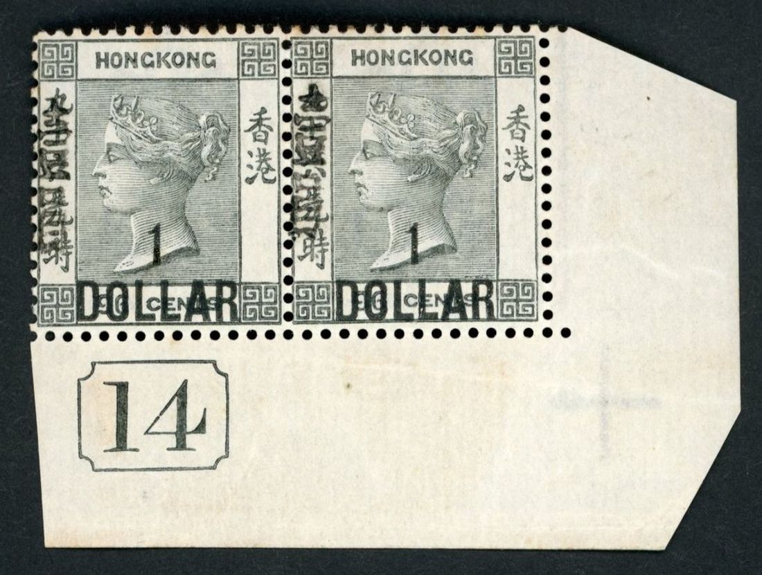 1898 surcharge by De La Rue with Chinese character $1 on 96c. black, lower right corner pair with plate no "14", unmounted mint, light toning, very fine. Yang 51