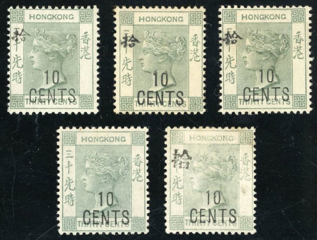 1898 surcharge by Noronba and Son in Hong Kong 10c. on 30c. (5) including without and with Chinese character, both types of Chinese, mint, slightly toning. Yang 53, 54, 54a