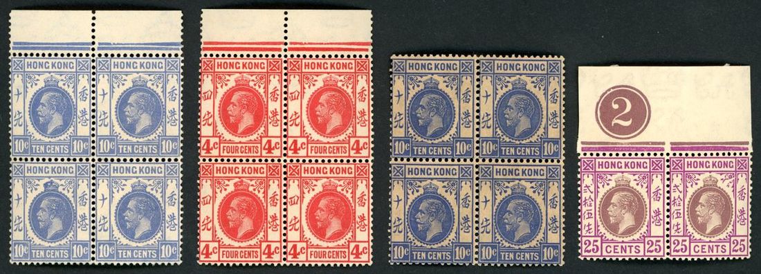 1921-37 wmk Multiple Script CA 4c. and 10c. (2) block of four, all with King's head shifted left or right variety, 25c. pair with plate number with broken flower variety, unmounted mint, lightly toned.