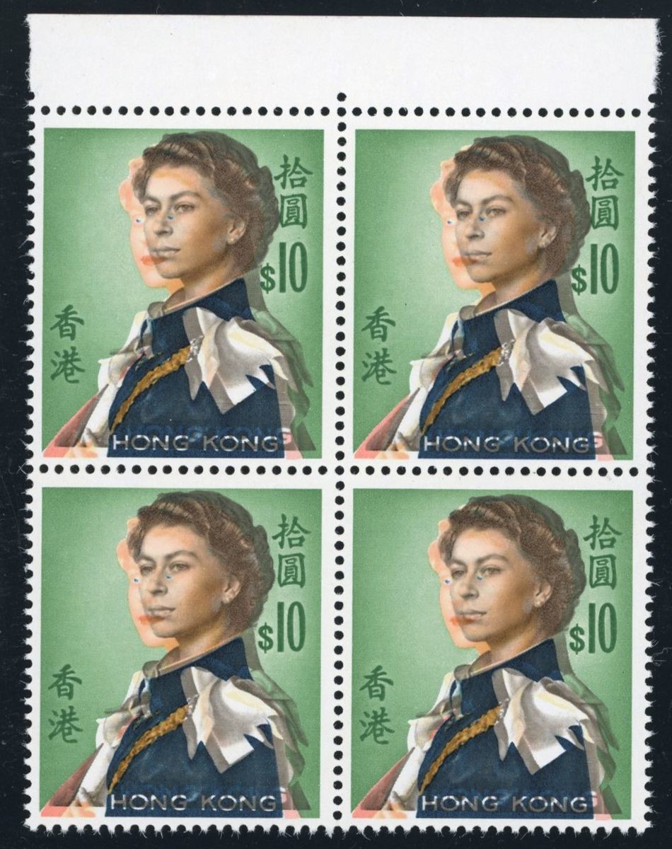 1962 Annigoni Portrait, arabic gum and PVA gum,$1.30, $2, $5 and $10 block of four with margin, all with colour shifted variety, unmounted mint, very fine.