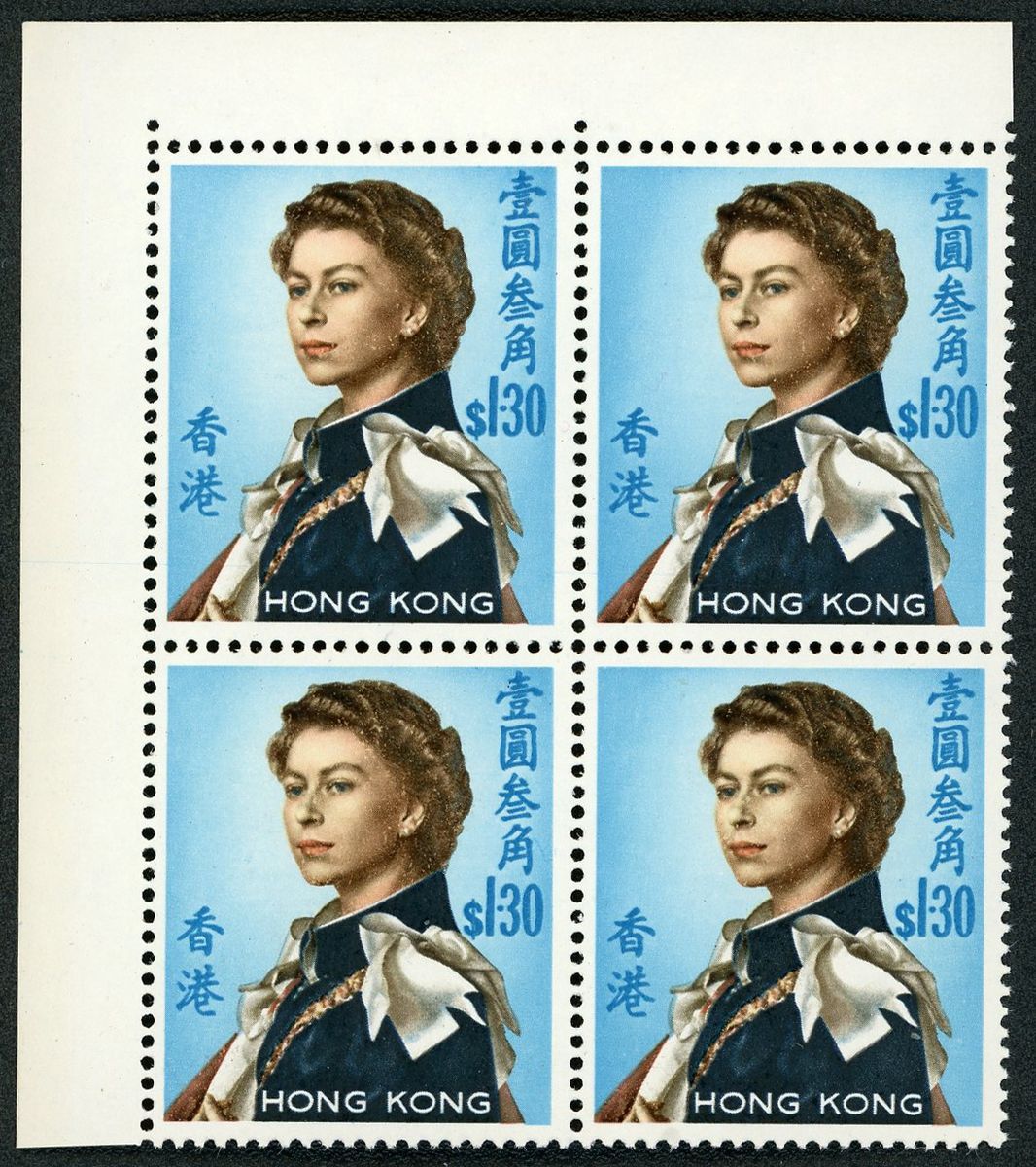 1962 QEII Annigoni $1.30 Left Top corner block of 4, with Pale Yellow omitted variety, fine unmounted mint.
