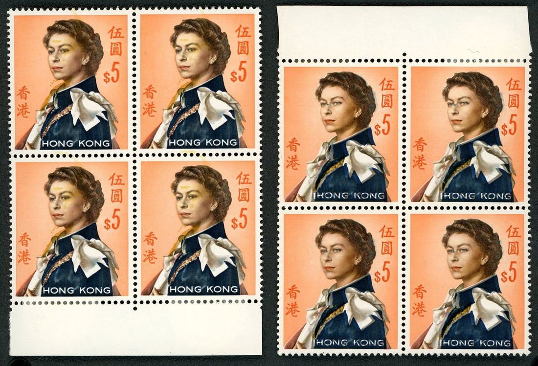 1962 QEII Annigoni Portrait $5 marginal block of 4 x 2, with shift colour variety, fine unmounted mint (2).